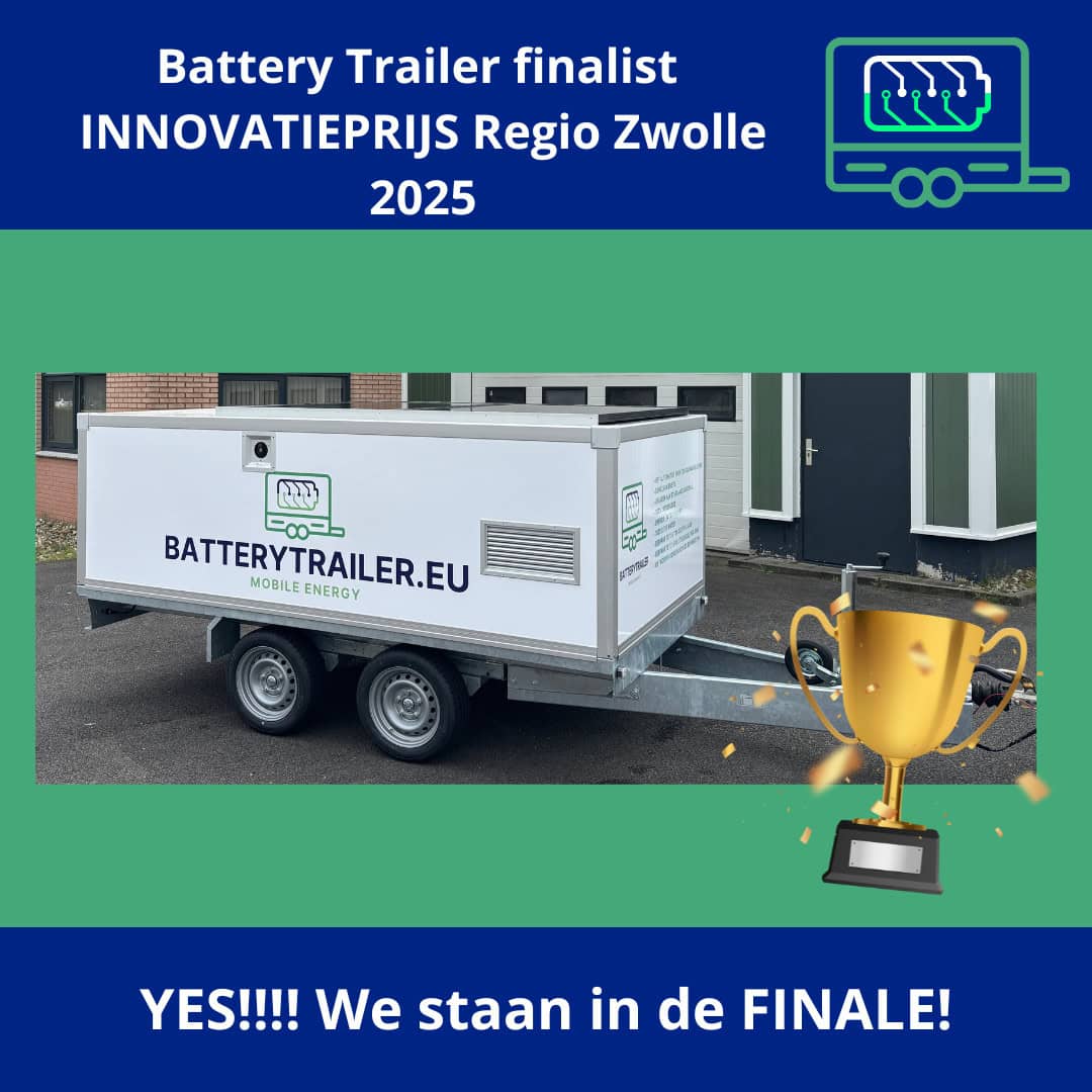 We zijn trots en dankbaar dat Battery Trailer is genomineerd als één van de drie meest innovatieve bedrijven uit de Regio Zwolle. De prijs wordt jaarlijks uitgereikt aan ondernemers die met hun product of dienst maatschappelijke impact maken en écht het verschil durven te maken.